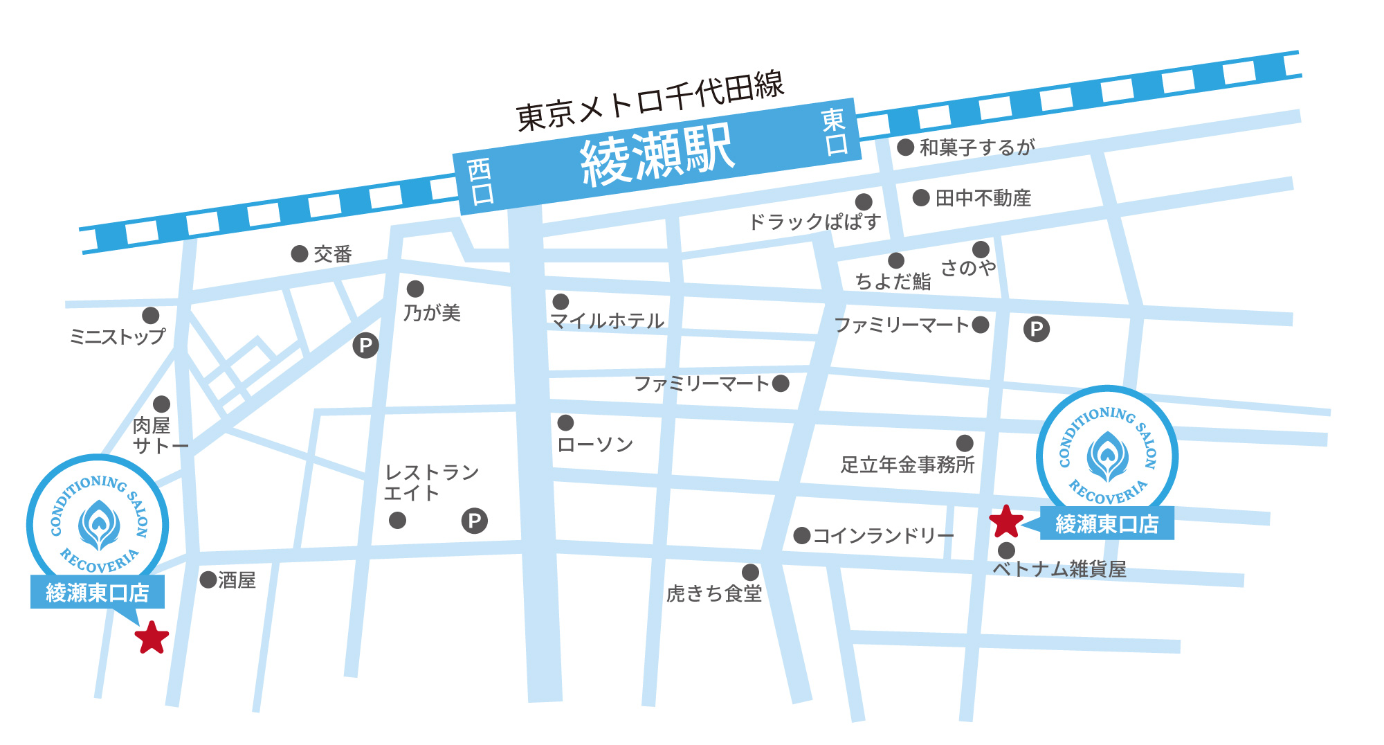 | 住所 | ◆綾瀬西口店 東京メトロ千代田線 綾瀬駅 西口改札より徒歩5分 東京都足立区綾瀬1-21-13 グランベールヨシダ402号室 ◆綾瀬東口店 東京メトロ千代田線 綾瀬駅 東口改札より徒歩4分 東京都足立区綾瀬2-11-3 コーポ蓬来102号室 綾瀬駅東口改札を出て右に直進します。和菓子するがと丸亀製麺の間を直進して、突き当りのT字路を左に曲がります。質屋さのやの角を右に曲がり、居酒屋の通りを直進します。足立年金事務所を右手に見ながら直進し続けると左手に見えてくる緑色のテントが目印です。ベトナム雑貨店の隣が当サロンです。 |